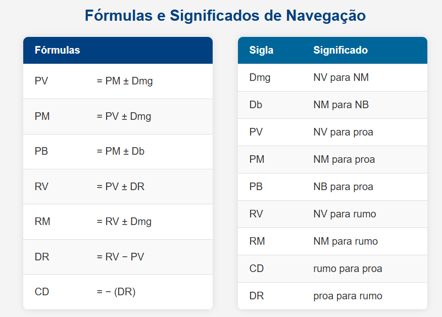 Esta conversão segue a sequência: RV → RM → PM → PB, onde RM é o rumo magnético (após aplicação da declinação magnética), PM é a proa magnética (após correção de deriva) e PB é a proa bússola (após correção do desvio bússola). Em forma de equação, temos: PB = PM ± DB, onde o sinal positivo aplica-se aos desvios oeste e o negativo aos desvios leste, seguindo a mnemônica “W é mais, E é menos”.